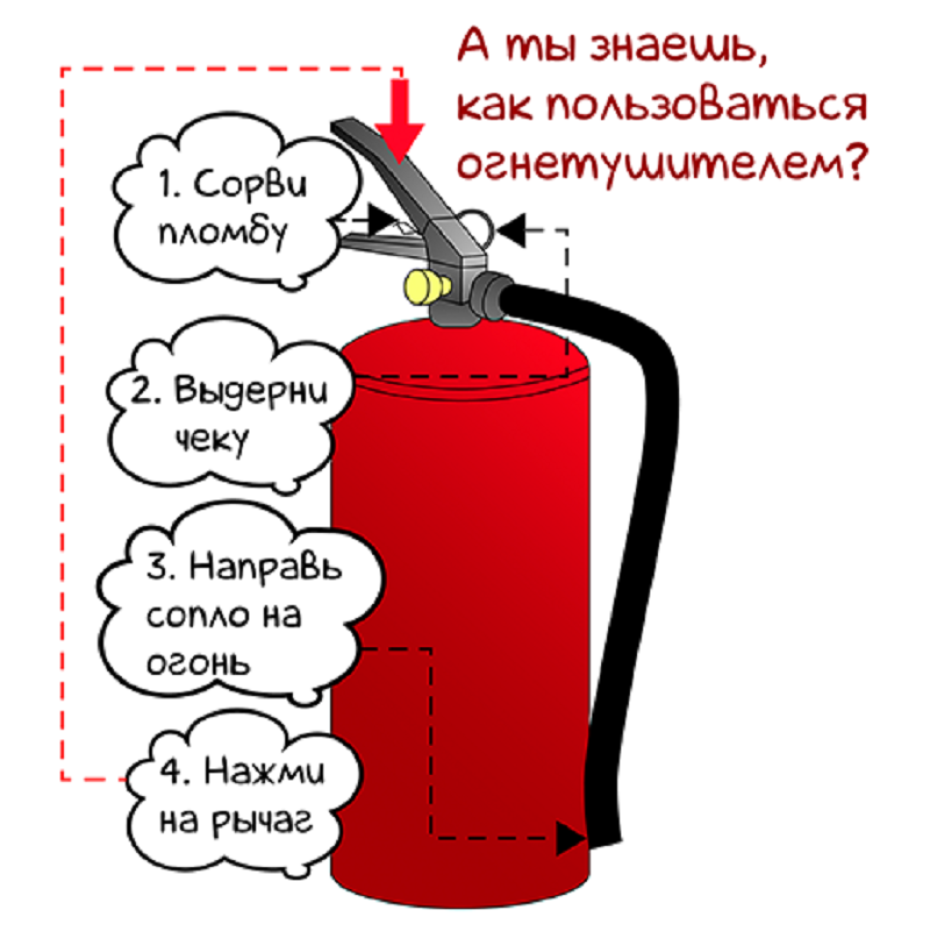 Помните: огнетушитель эффективен только на начальной стадии пожара. Если вы не смогли справиться с пламенем в течение первых секунд, огонь распространяется, а в помещении становится жарко и дымно – не геройствуйте.